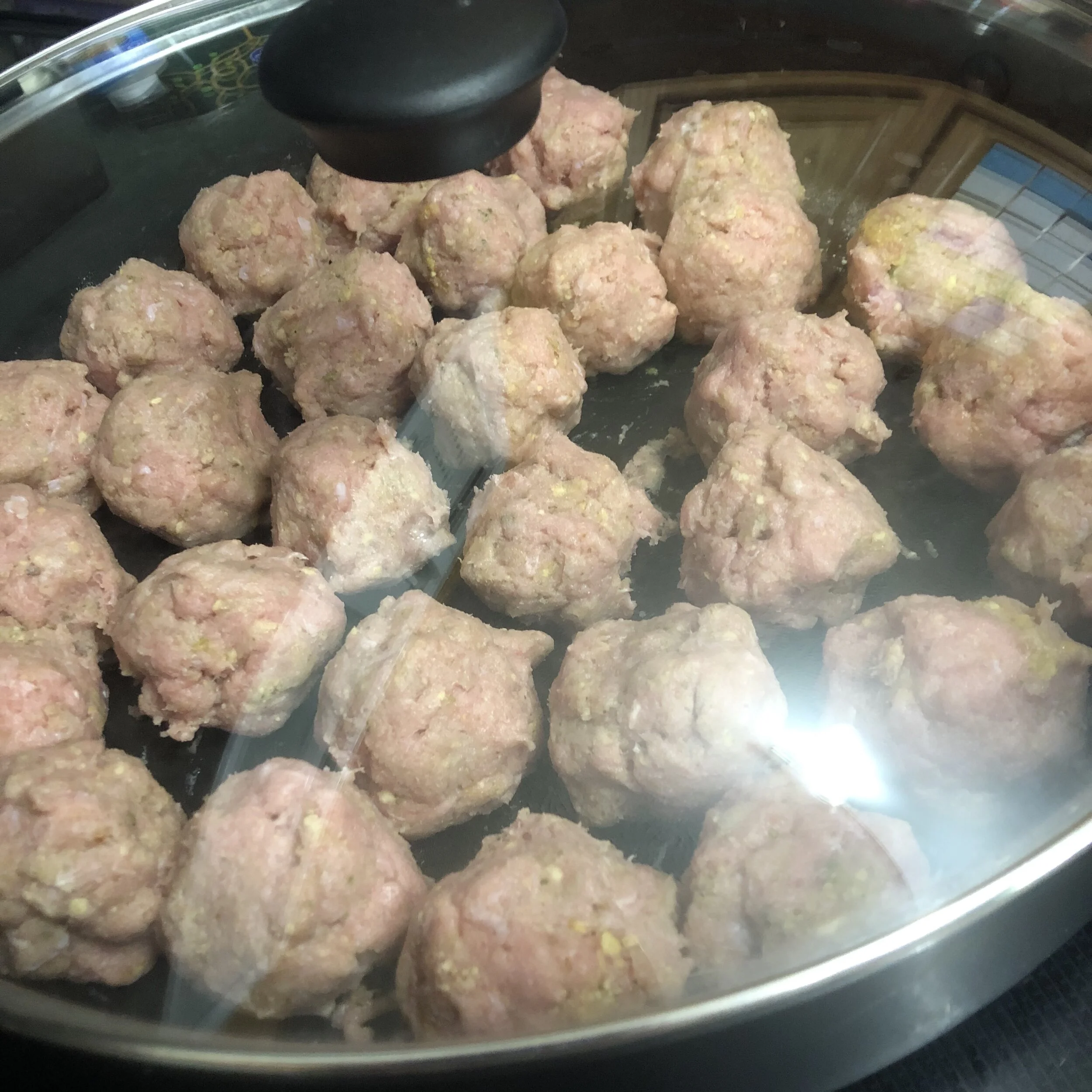 After forming the meatballs, place them in a single layer at the bottom of a large skillet. Cover and cook, stirring occasionally. When the outsides begin to brown, remove the lid and add the mustard & soy sauce. Stir well and continue cooking until all liquid is gone.*