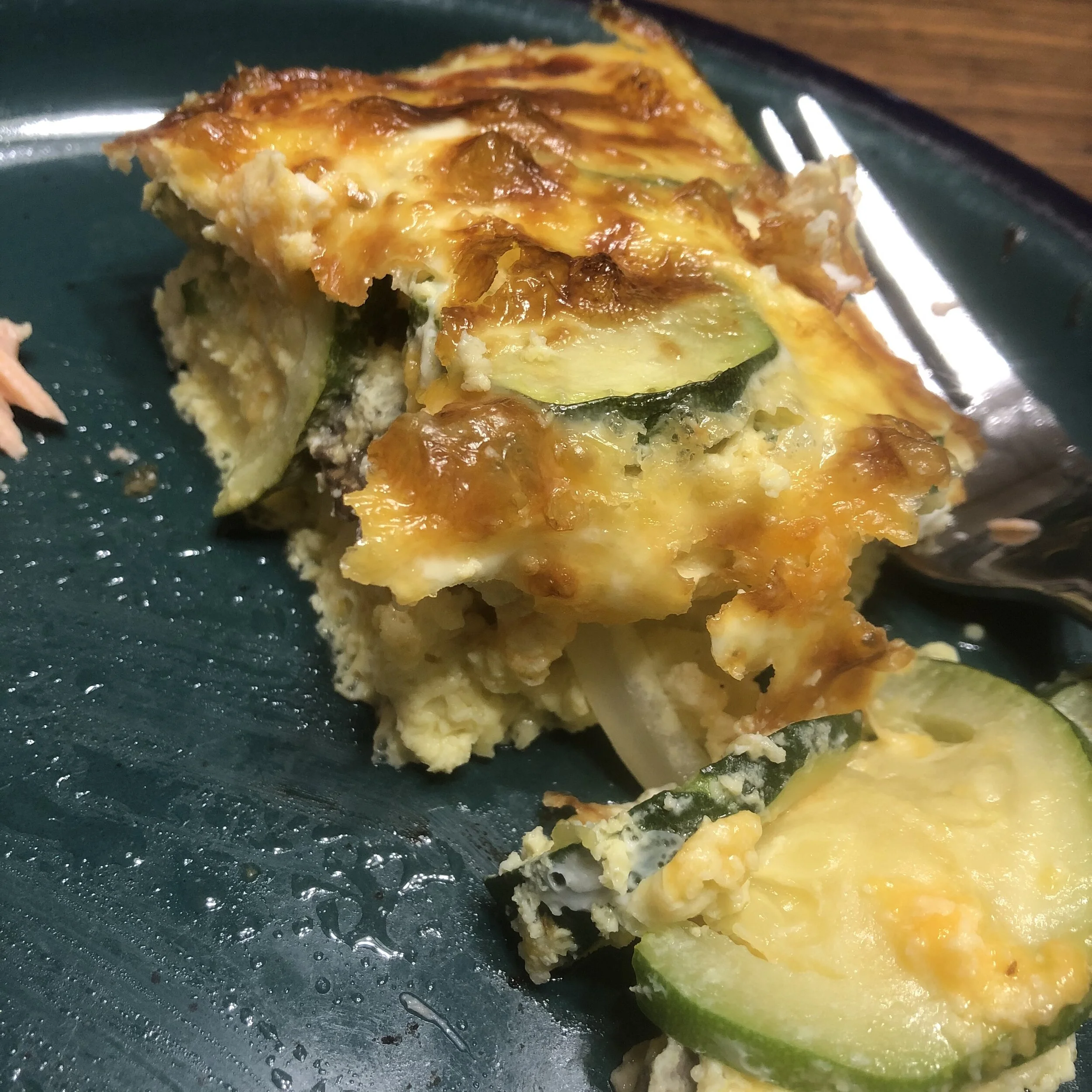 Grease the bottom of a 6.5 x 10.5* casserole dish. (I used bacon grease, but butter or cooking oil would also work.) Spread out the mushrooms in the bottom of the dish, then spread the zucchini and onions on top. Whisk together the remaining ingredients and pore them over the veggies.